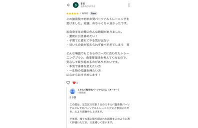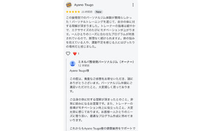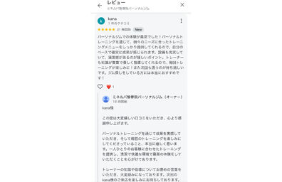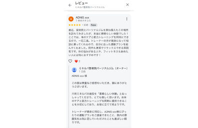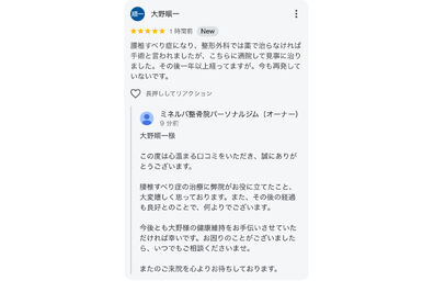 体のメンテナンスを丁寧にやって頂き感謝しています。