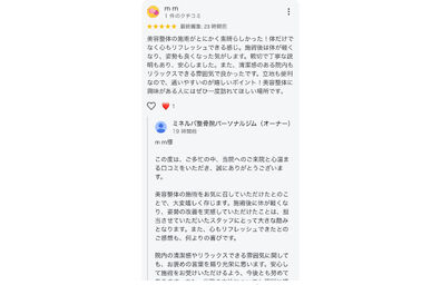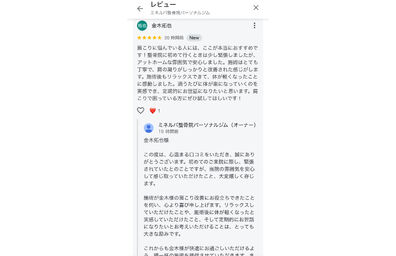 改善されず、通りかかったこのミネルバさんを見かけて気になったので入ってみました。マッサージ中心の治療法とは違い鎖骨と骨盤の矯正という方法で整えてもらいました。同じように悩んでいる方がいたら是非このミネルバさんに来てみてください!