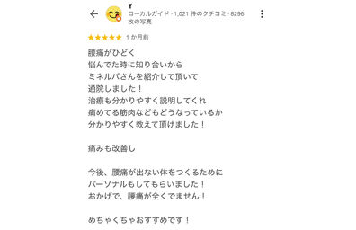 チラシを見て来院しました。腰痛が長年続いていましたがミネルバさんにきてから痛みで困ることが少なくなりました。ありがとうございます。また、来ます